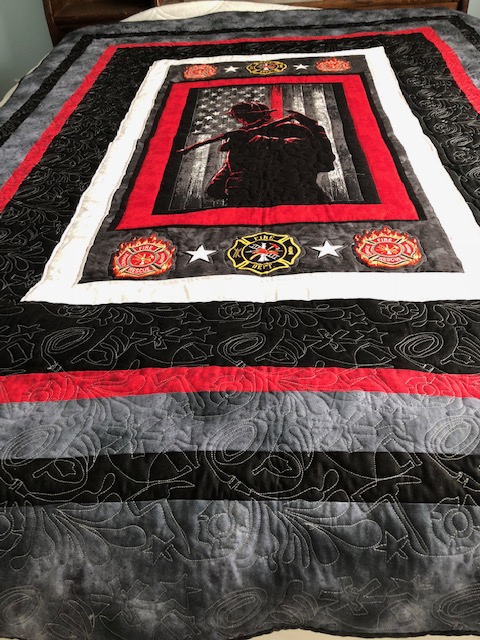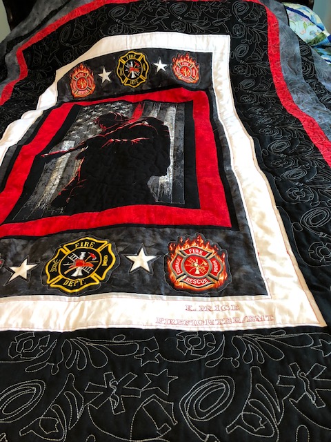 I pieced this firefighter’s quilt by using a panel with borders. I used the borders as a frame around the panel and did hand-guided edge to edge quilting in the borders. The panel was highlighted be free motion echo stitching and free motions swirls. I also put the person’s name and ranking in by machine stitching.